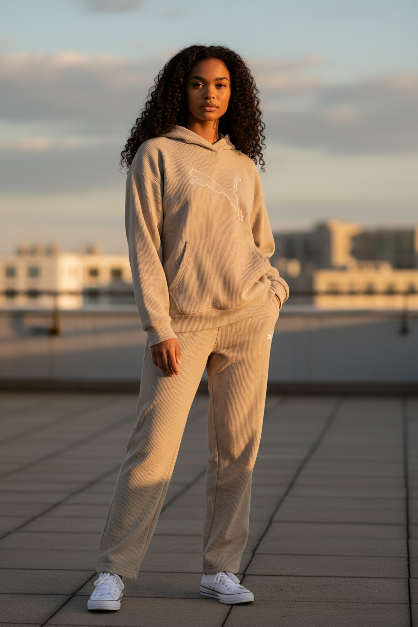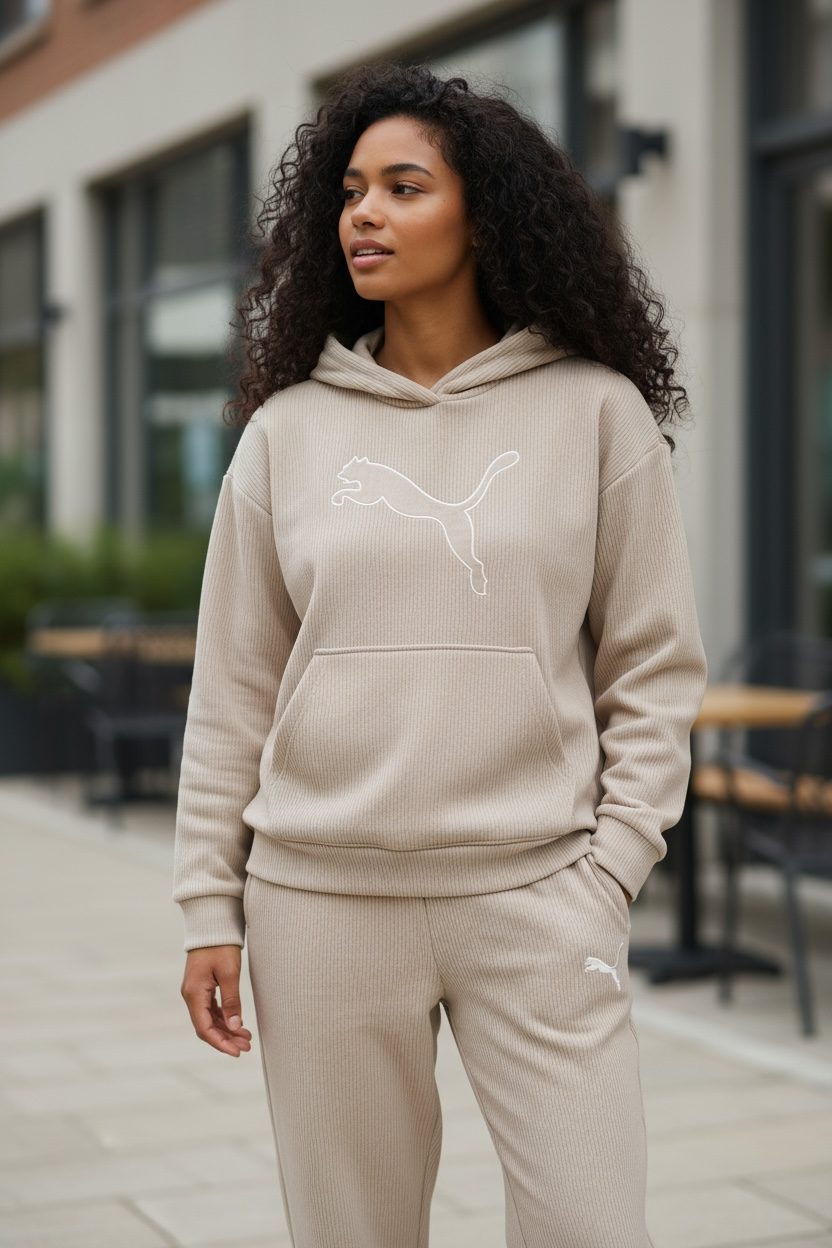 Stay stylish and comfortable in this women’s hoodie and jogger set. Made from a soft-touch polyester blend, this casual two-piece outfit is perfect for everyday wear, lounging, or travel. The pullover hoodie features a bold front logo design, paired with matching joggers for a complete sporty look.