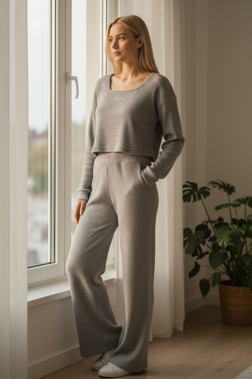 Keep it cozy yet stylish with this women’s ribbed lounge set in light grey. Designed with a modern square-neck ribbed top and matching joggers, this two-piece is crafted from soft cotton-blend fabric with stretch for maximum comfort. Ideal for lounging, errands, or travel days.