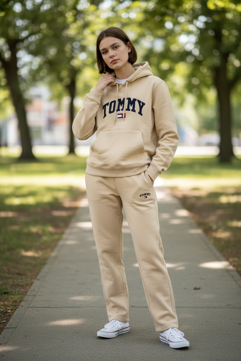Set-first comfort with a polished finish. This women’s beige premium fleece hoodie and joggers set pairs soft-touch fleece with a relaxed, modern silhouette for everyday ease. The matching co-ord delivers warmth without bulk and styles effortlessly for home, errands, campus, travel, or casual meetups.